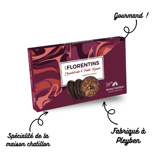 Chocolat noir 26% (pâte de cacao 45% – sucre – beurre de cacao – émulsifiant : lécithine de soja), sucre, amandes effilées, beurre demi-sel frais, raisins secs, cubes d’oranges confites (écorces d’oranges – saccharose – sirop de glucose – sucre, acidifiant : acide citrique), cranberries sèches 7% (cranberries, sucre, huile de tournesol), crème, miel 5%, arôme naturel de fruits rouges.