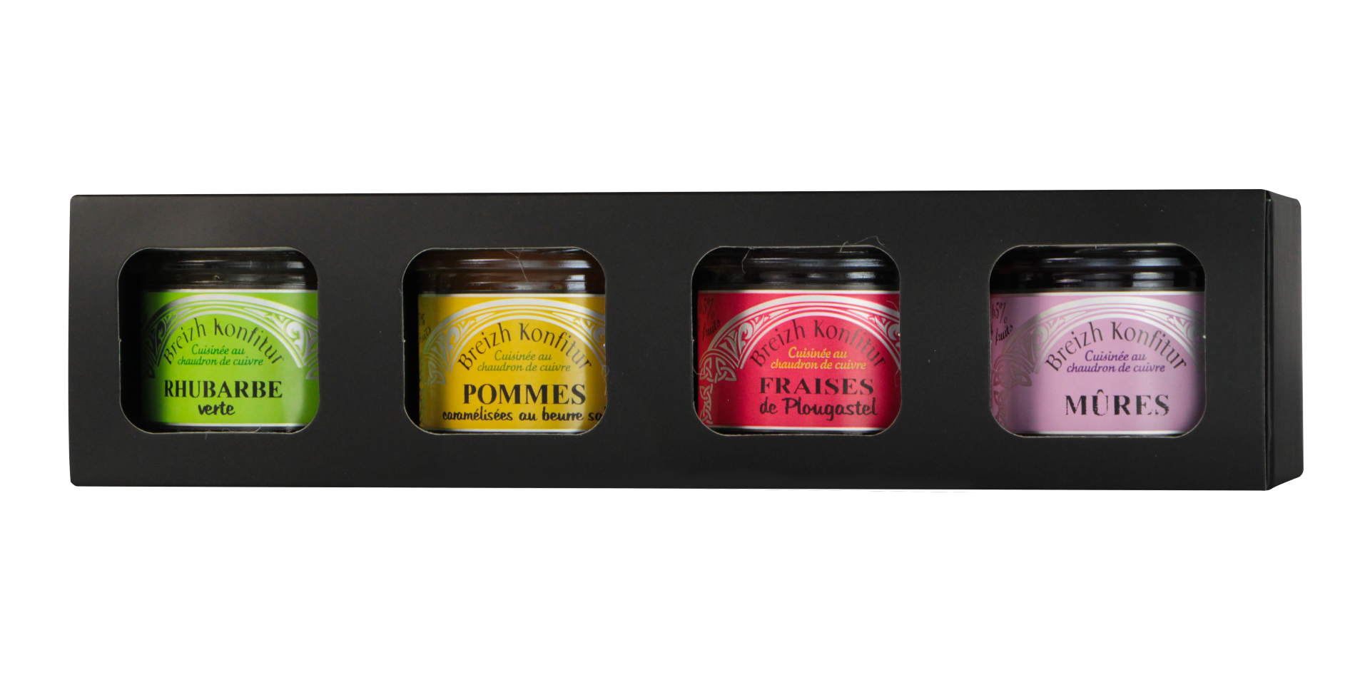 Découvrez un assortiment exquis de confitures artisanales avec notre Coffret Sélection. Ce coffret contient quatre parfums sélectionnés avec soin : Fraise de Plougastel, Rhubarbe, Mûres, et Pommes Caramélisées au Beurre Salé. Parfait pour offrir ou pour se faire plaisir, chaque pot est un véritable délice qui capture les saveurs authentiques de la Côte.