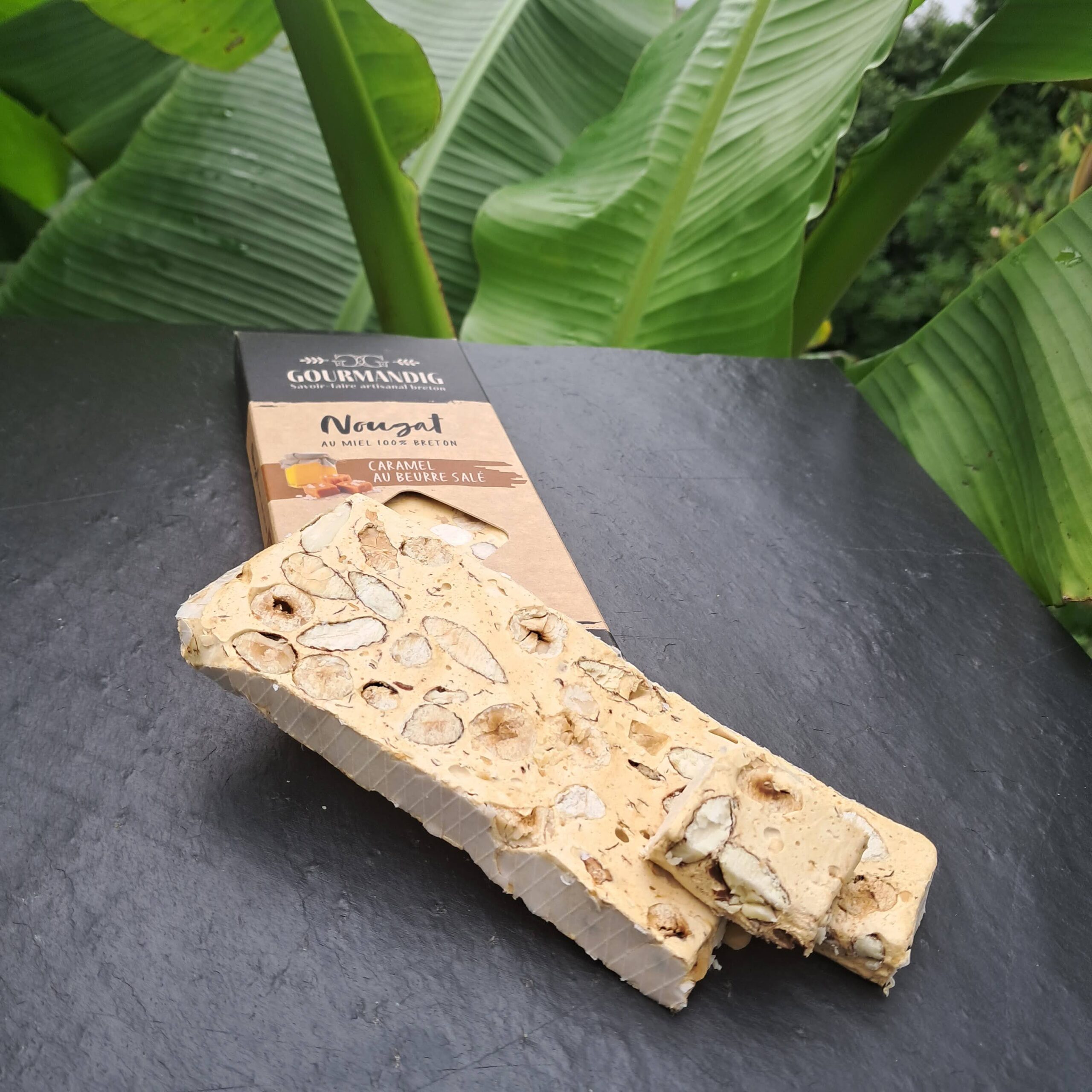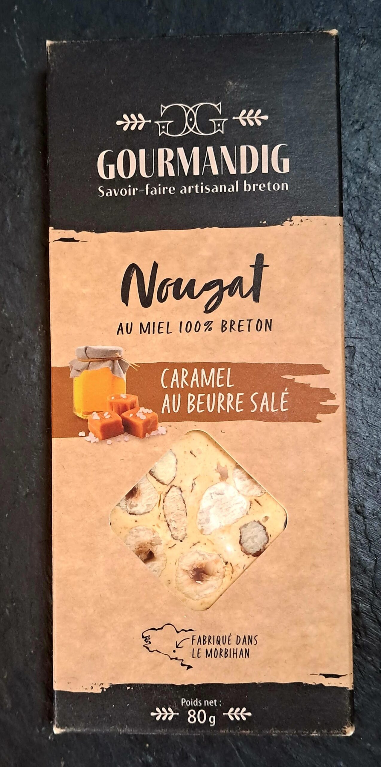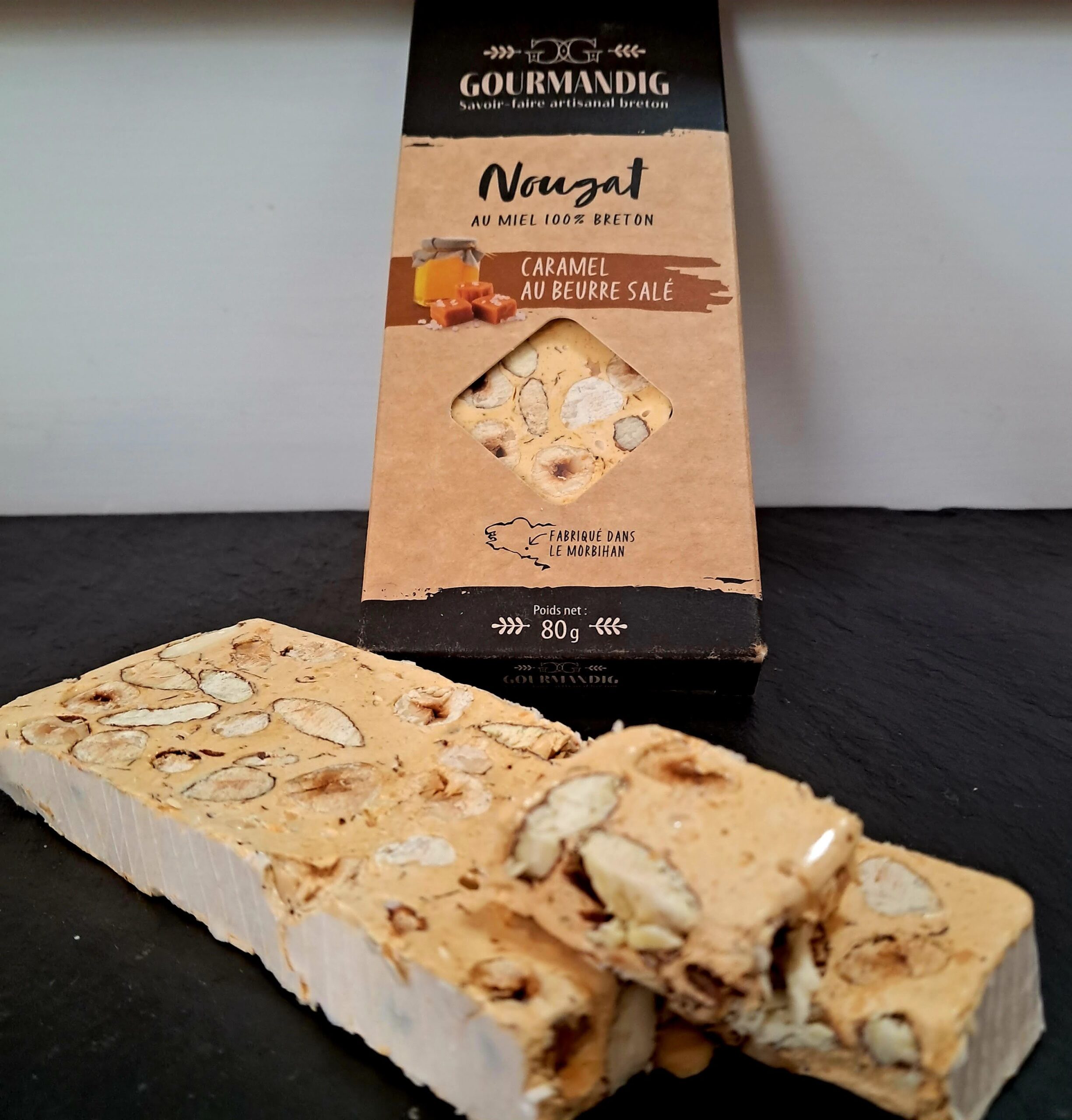 Ingrédients : Miel de Bretagne toutes fleurs 25%, Sucre, Amandes, Noisettes, Caramel au beurre salé 7% (beurre, lait, sucre) Sucre Glace, Blancs d’oeufs déshydratés, feuille azyme (fécule de pomme de terre, huile de tournesol), sel de Guérande, sucre vanillé (sucre et vanille de Madagascar)